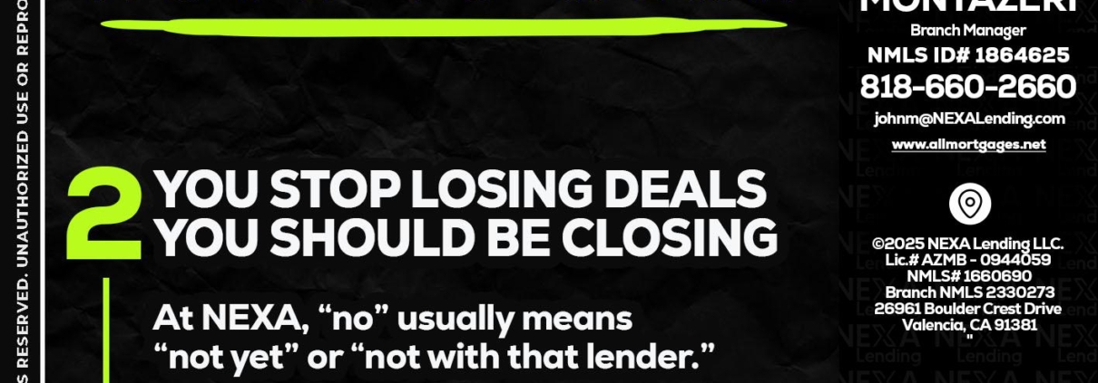 7 THINGS (2) - John Montazeri -Branch Manager - Property Lending SpecialistHi, my name is John Montazeri. I’m a Loan Officer with NEXA Lending LLC., offering personalized mortgage solutions, fast customized quotes, great rates and service with integrity.