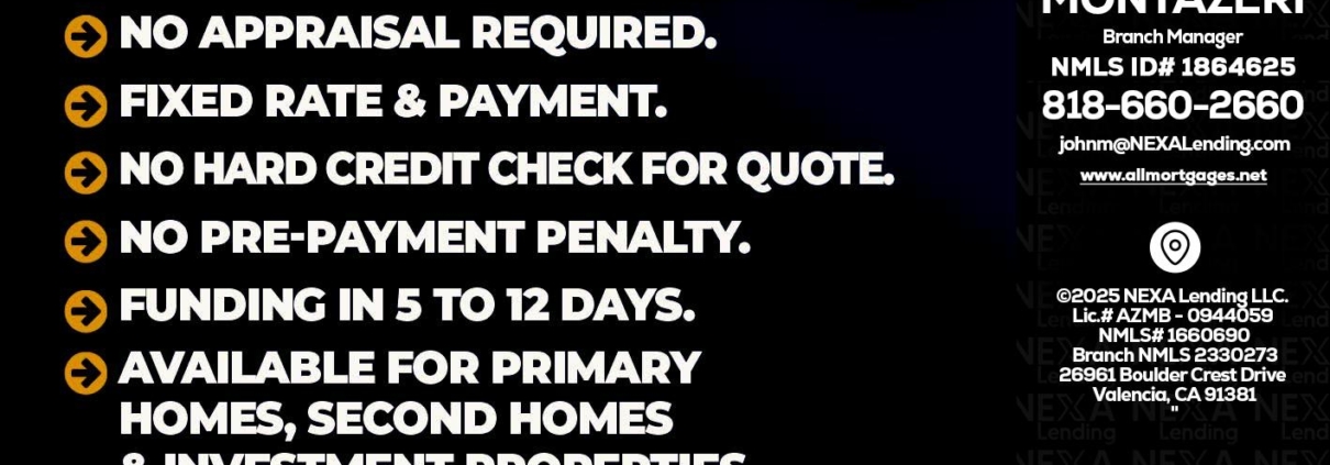 Hi, my name is John Montazeri. I’m a Loan Officer with NEXA Lending LLC., offering personalized mortgage solutions, fast customized quotes, great rates and service with integrity.
