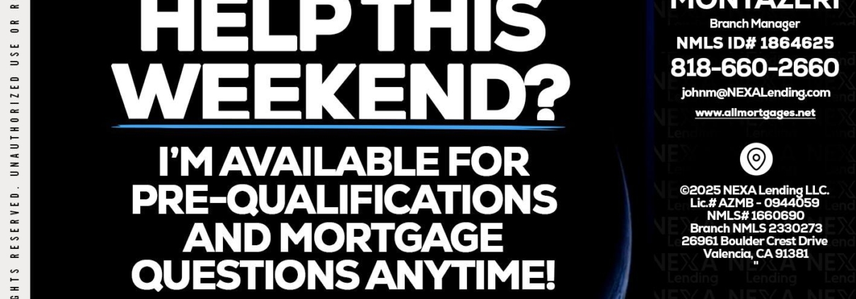 Hi, my name is John Montazeri. I’m a Loan Officer with NEXA Lending LLC., offering personalized mortgage solutions, fast customized quotes, great rates and service with integrity.