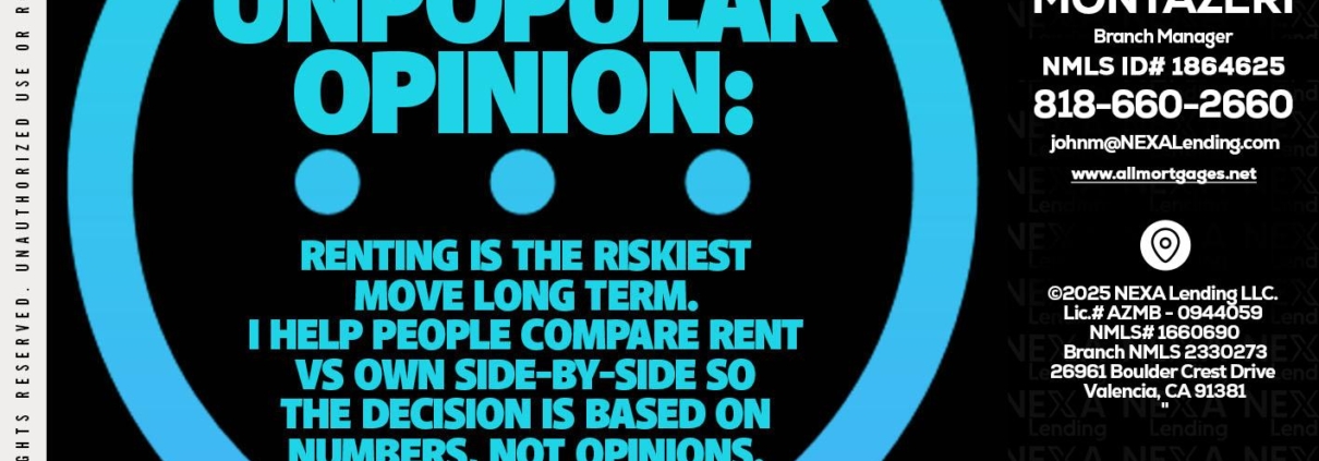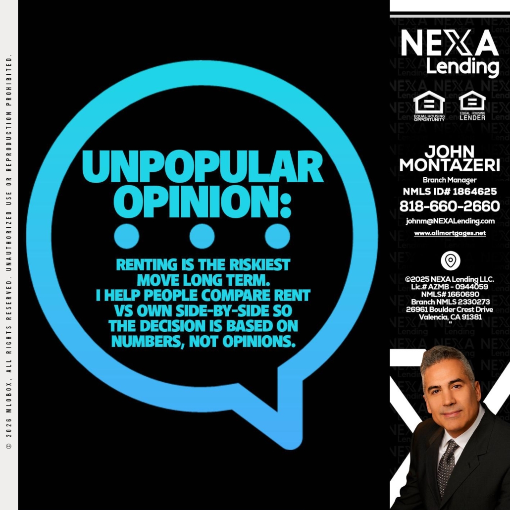 unpopular opinion - John Montazeri -Branch Manager - Property Lending SpecialistHi, my name is John Montazeri. I’m a Loan Officer with NEXA Lending LLC., offering personalized mortgage solutions, fast customized quotes, great rates and service with integrity.
