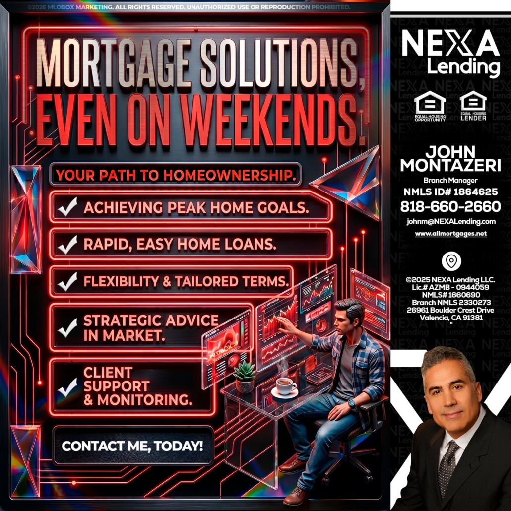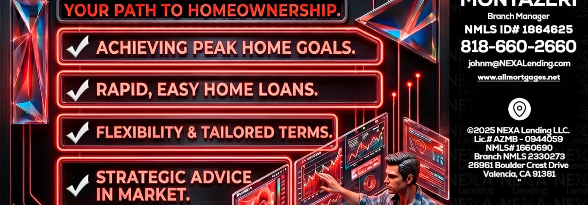 Hi, my name is John Montazeri. I’m a Loan Officer with NEXA Lending LLC., offering personalized mortgage solutions, fast customized quotes, great rates and service with integrity.